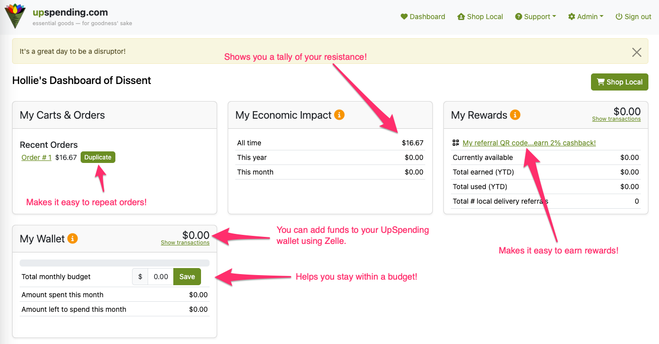 We promise that the goods you purchase from UpSpending.com are sourced from local businesses and/or companies that do NOT contribute to corporate influence in our government. We use the “Goods Unite Us” app and focus on purchasing goods from companies that have a positive campaign finance score or who do not contribute to campaigns at all (preferred).